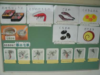 児童の興味を引くように工夫したいろいろな掲示物が、校内にあります。保健室前には、健康おみくじがあります。児童は、おみくじを引いて、出た番号のカードを見ます。カードには、健康についての内容が書かれてあります。また、給食室前には、春の七草やおせち料理のことを掲示してあります。楽しみながら、いろいろなことを学んでほしいと思っています。