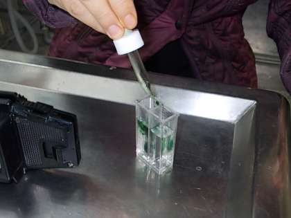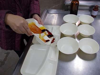 洗浄済みの食器に脂肪やでんぷんが残っていないかを調べたり、水質を調べたり、釜の上の電気の明るさを調べたりします。安全でおいしい給食のために学期はじめに行っています。