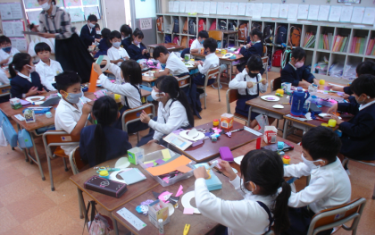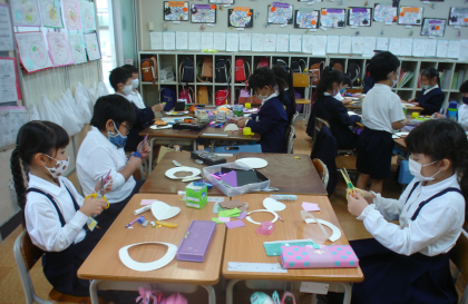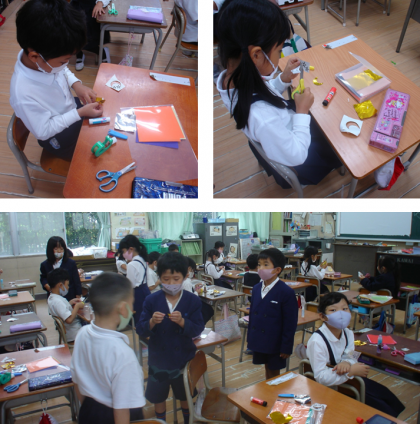 1年生の教室では、ハロウィンにちなんだ作品の掲示や、紙皿を活用したリースづくりがはじまったようです。
