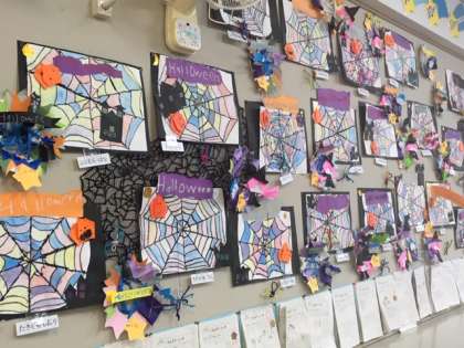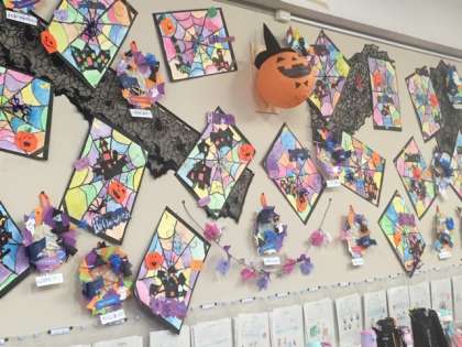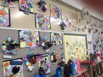 1年生の教室の背面は、ハロウィンの飾りでいっぱいです。