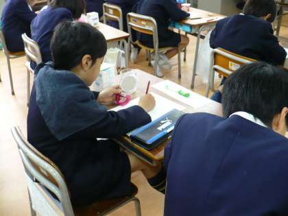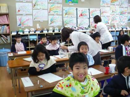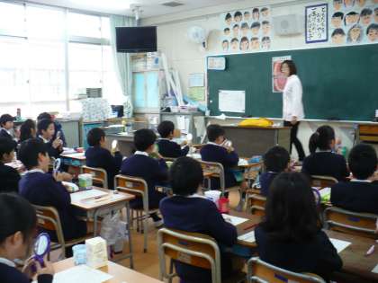 1月27日(火)歯みがき指導のために、教育委員会から2名の先生に来ていただきました。赤い染色液を使い、どこが磨けてないかを確かめました。真っ赤に染まった口の中を見て、歯みがきの大切さを学びました。