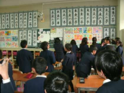 1月29日(木)書き初め鑑賞を全校児童で行いました。掲示した書き初めを、2時間目に一斉に教室を回って鑑賞しました。