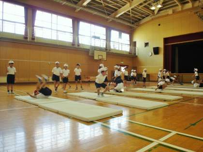 体育館では、今日から始まったマット運動に少し戸惑いながらも、担任の先生の手本を元に、開脚前転・後転や側転に挑戦していました。