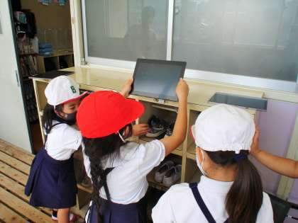 また、タブレットを使ったクラスでは、学習園でホウセンカやマリーゴールドの観察に出かけるところでした。