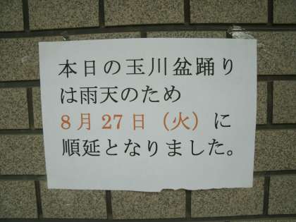 8月24日(土) 玉川小学校の校庭に於いて、地域主催の盆踊りを予定していましたが、雨天のため8月27日(火)に延期になりました。27日晴れますように。