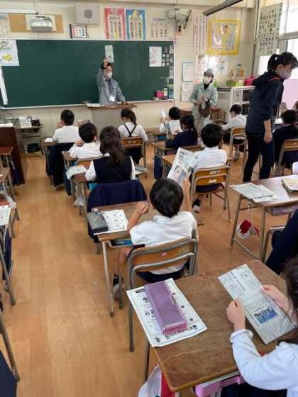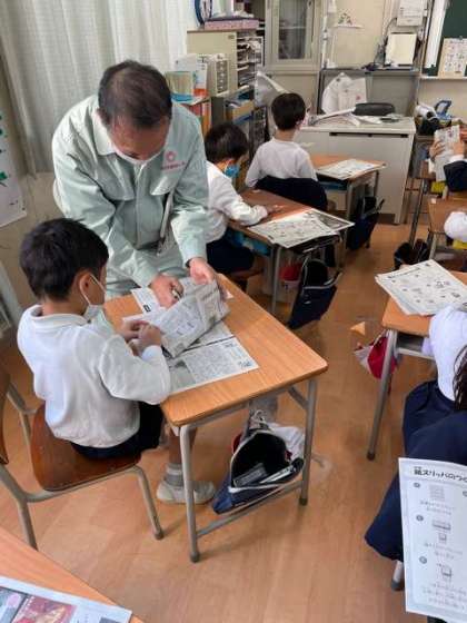 ガラス片に見立てたテープの上を作った紙スリッパを地域防災の方の指導のもと作成しています。