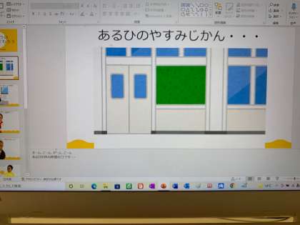 続いて、生活指導の先生が制作した「がっこうの決まりをまもろう」というデジタル紙芝居的なソフトを使って、決まりを守ることの大切さについて学びました。途中、玉川小学校の先生が登場する場面もあり、身近に受け止めることができる内容構成に、児童みんなが真剣な眼差しで視聴していました。
