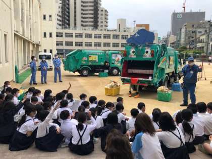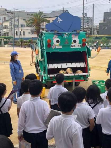 4年生は、今、社会科で「住みよいくらしとごみ」の学習を進めていますが、本日(5月6日)、大阪市西北環境事業センターより職員の方々にお越しいただき、ごみを集める仕事について、詳しく教えていただきました。