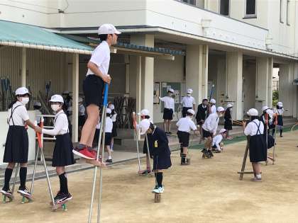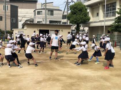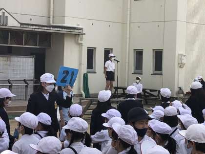 はじめに、朝会台前に各班ごとに整列し、その後、遊びブースに分かれます。どちらのブースでも6年生がリーダーシップを発揮し、楽しく取りめるように班のみんなをリードしていました。