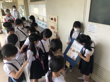 各ポイントとなる特別教室等には2年生の児童が2名ずつ待機し、到着した班に説明を行っていました。説明を最後まで聞くとシールを貼ってもらえるので、1年生はとても喜んでいました。