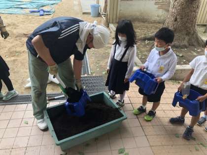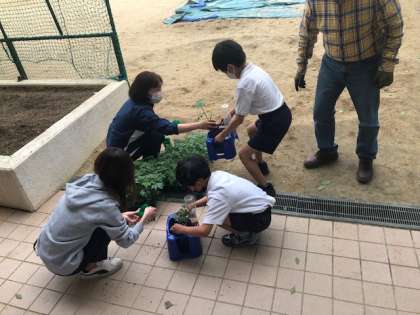 次に苗をもらって植えます。土をたくさんかぶせてねと先生に言われて焦る子もいましたが、みんな楽しそうに植えていました。