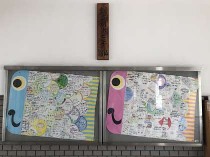 今月は、5年生が5月の節句のこいのぼりにみたてた「メッセージこいのぼり」です。うろこの部分に、子どもたちのメッセージがあります。