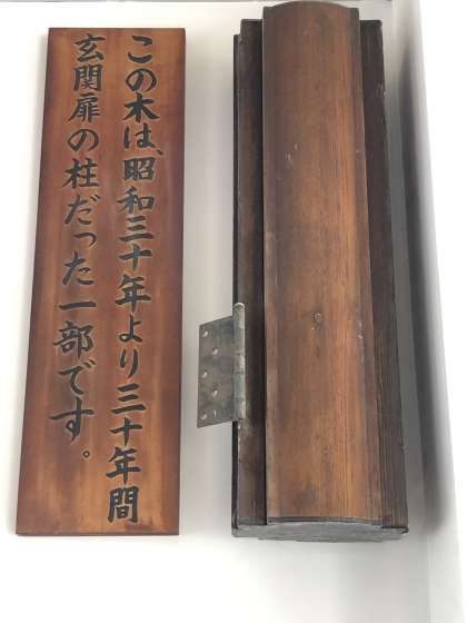 掲示板の上には、「創立明治七年1874」と記された木製の板と、「この柱は明治三十年より三十年間、玄関扉の柱だった一部です」と記された木製の板と実際の柱が掲げられています。木製の板は色や材質から、きっと玄関扉の柱と同時期のものではないかと推測されます。