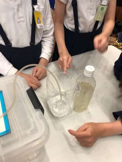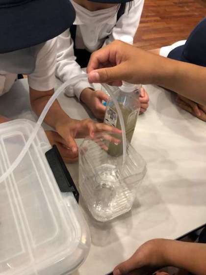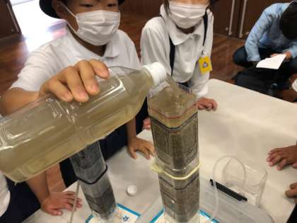 施設内見学を終えたあとで、淀川の水がきれいになるまでの実験を行いました。