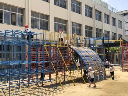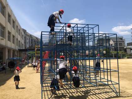 朝からどんどん気温が上がり、午後1時には最高気温が28度に達しました。たいへん熱くなりましたが、「そんな暑さなんかへっちゃらさ」と言わんばかりに、1年生は校庭や遊具で遊んでいました。朝から快晴の青空は、さらに色を深めているように感じました。
