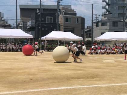 自分の背丈より大きな大玉をうまくころがして、次のペアにつなぎました。