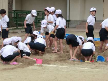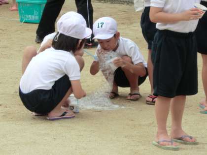 1年生の生活科の時間でどろんこ遊びとシャボン玉遊びを行いました。子どもたちは遊びの中で様々な工夫をして楽しんでいました。後片付けの時には友達同士協力し合ったり、先生のお手伝いを率先してしてくれたりと、子ども同士が関わり合いの中で成長している姿が見られました。
