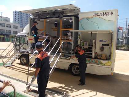 消火器体験・地震体験。消火器体験は運動場で水消火器で的に向かって水を放水する体験をしました。消防署の方の説明をしっかり聞いて取り組んでいました。地震体験は、地震体験車で南海トラフ地震を想定した揺れを体験しました。手すりをしっかり握って安全に取り組めました。