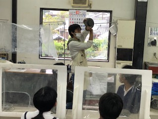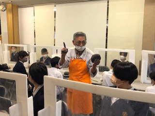 お店の方に陶芸作品作りの手順について、説明を受けています。みんな真剣な眼差しで聴き入っています。