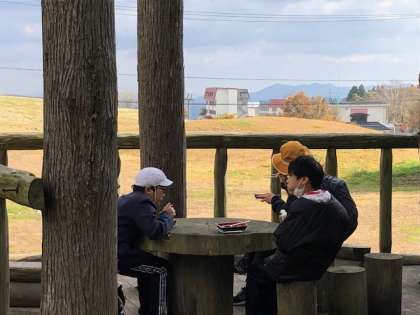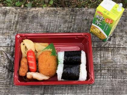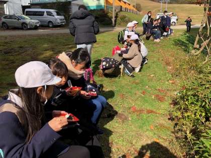 宿舎前の林の中で、お昼ご飯のお弁当をいただきました。とても美味しかったです。