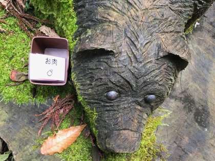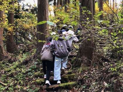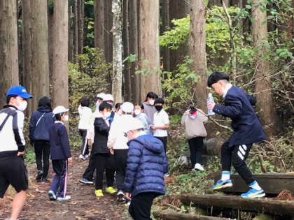 お箸づくりを終えた後、明日の飯盒炊飯の食材探しを、宿舎の裏山にあるアスレチック施設を利用しておこなっています。