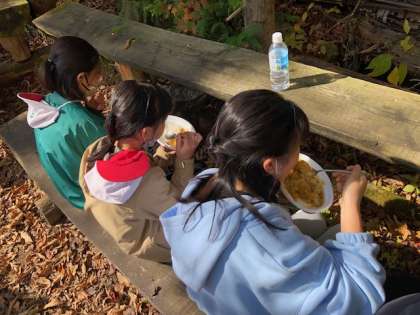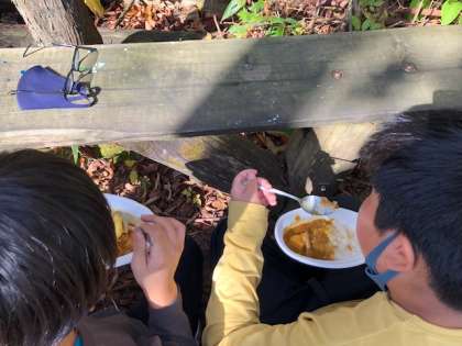 「めちゃくちゃ美味しい」という声が聞こえます。みんなで力を合わせて調理したので、今まで食べたカレーよりもさらに美味しく感じるでしょうね。