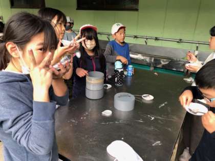 手作りアイスクリームで、至福のひとときを過ごしています。みんな満面の笑顔です。