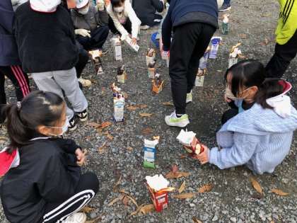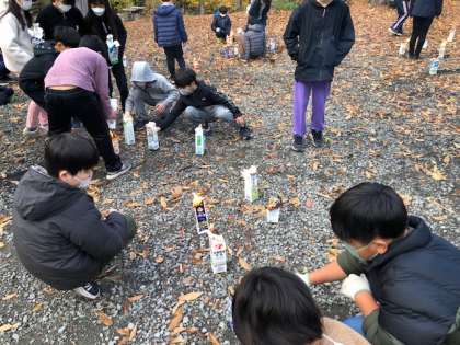 ほとんどのグループが牛乳パックに火をつけています。完成まであと少しですね。楽しみです。