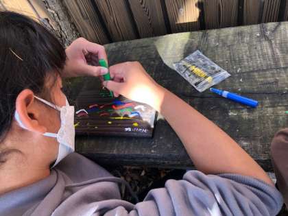 金具とひもを取り付け終わると、一人ひとり思い思いの絵や文字を描いていきます。どんな内容にしようかと真剣な表情で考え、黙々と進めています。