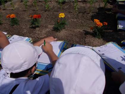 学習園で育てるほうせんかを観察しに来ました。「何センチかな?」「他にもオレンジや黄色の花が咲いているね」などの声が聞かれました。大きく育つといいな。