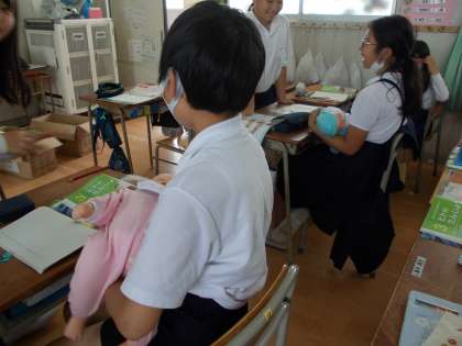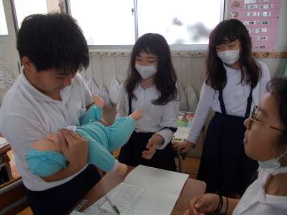 理科の学習「ヒトの誕生」について勉強しました。ぎこちなくお人形の赤ちゃんを抱っこする姿が愛おしいです。