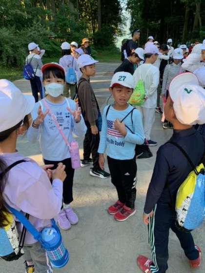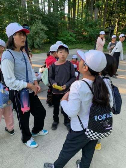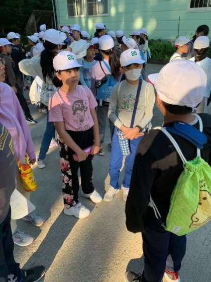 登山前にみんなが登り切るにはどうすればいいか活動班ごとに話し合っています。