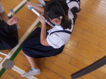 空気鉄砲で「どうすれば遠くまで飛ばすことができるかな?」という実験中!