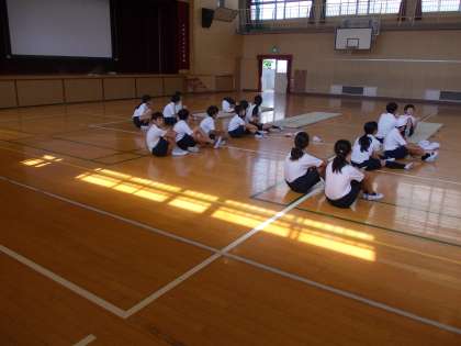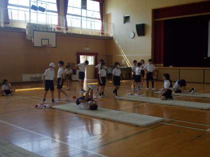体育の授業の1コマ。後転や開脚後転などの技の練習をしています。友達にアドバイスをもらい頑張っています。
