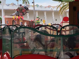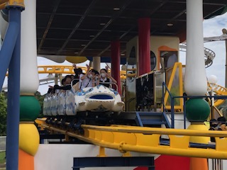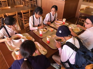 アトラクションの合間に食事をして、グループで協力しながら活動しています。