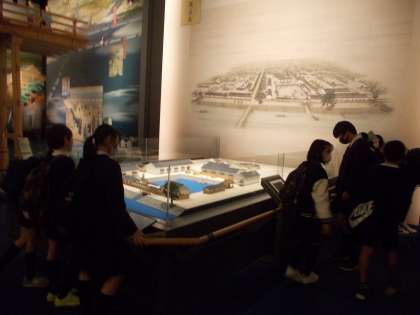 昼からは、大阪歴史博物館に行きました。古代フロアの太極殿や中世近世フロアの水都めぐり、近現代フロアの街のパノラマ、歴史を掘る・特集展示フロアを見学しました。