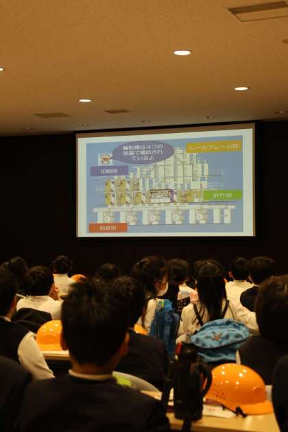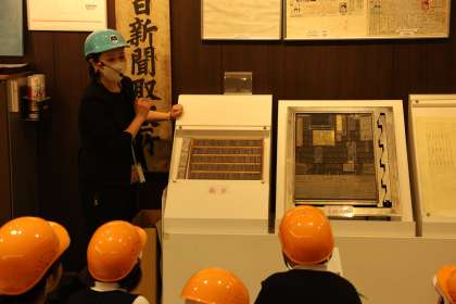 大阪工場では、新聞づくりの歴史や新聞ができるまでの工程、その機械の説明などを聞きました。そして、いよいよヘルメットをかぶり、今まさに稼働している工場内へ。そこでは、一度手をたたく間に、44部も新聞が出来上がっていくというスピードに驚いた様子でした。