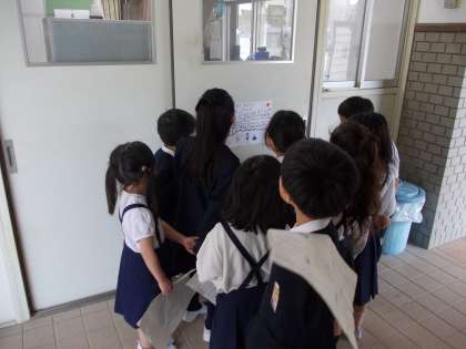 4月24日(水)1・2年生の学校案内がありました。班に分かれて学校のいろいろな教室をまわりました。2年生が1年生を優しく案内してくれました。