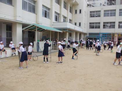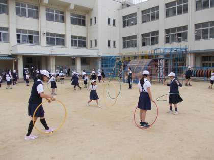 運動場や講堂では、いろいろドッジ、平均台遊び、しっぽとり、フラフープなど14の遊びに取り組んでいます。教室では、じゃんけん列車や酋長さんの命令などいろいろな室内遊びを楽しんでいます。6年生が中心になって準備をしてくれています。異学年交流の活動として1年生から6年生まで仲良く取り組んでいます。