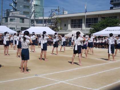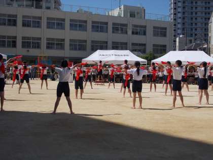 プログラム2番は、応援団による応援合戦でした。応援団が赤、白、両チームを盛り上げました。団長の掛け声に続いて、自分のチームを応援しました。