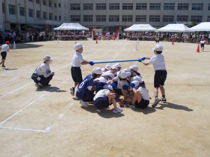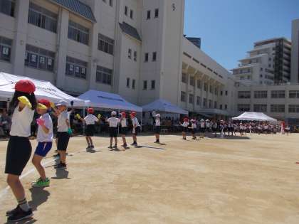 プログラム3番は、3年生の団体競技、まわって3!つないでSUN!みんなで賛!でした。大阪万博のテーマ曲「この地球(ほし)の続きを」に合わせて明るく元気に踊りました。「台風の目」もみんなで力を合わせました。