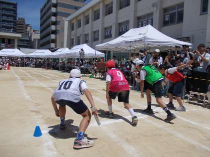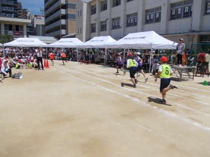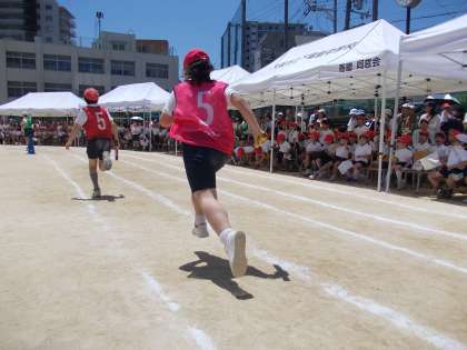 プログラム12番は、5年生による紅白対抗リレーでした。バトンパスに苦戦しながらも、粘り強く練習を重ねました。「Go!ハイ!」のかけ声とともに一生懸命バトンをつないでいました。