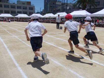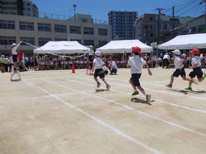 プログラム14番は、1年生のかけっこでした。元気いっぱいの1年生がゴールまで一生懸命走りました。最後まであきらめないで頑張りました。
