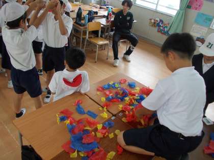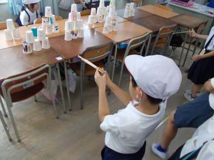 〇射的…割り箸でゴム鉄砲を作り、紙コップの的をねらいました。