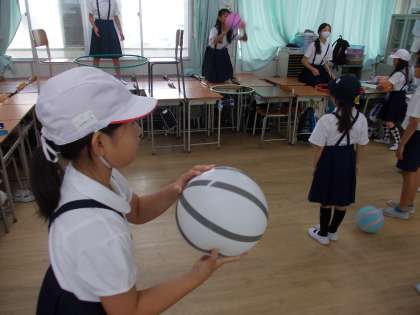 〇フリースロー…フラフープの輪にビニールボールを投げ入れます。バスケットボールのフリースローのようにうまくいったかな。