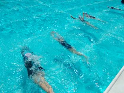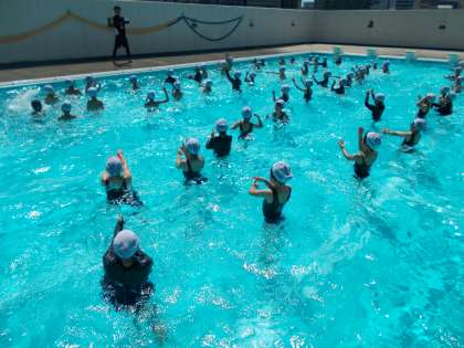 2年生のプール水泳は、蹴伸びとバタ足で泳ぎました。体の力を抜いて浮き、力強くバタ足をして前に進みました。元気よく速く泳げていました。