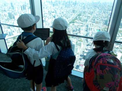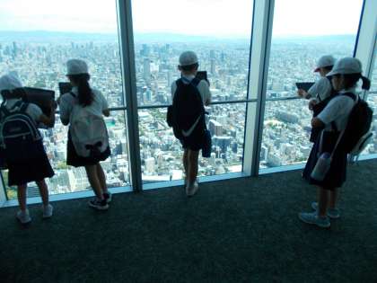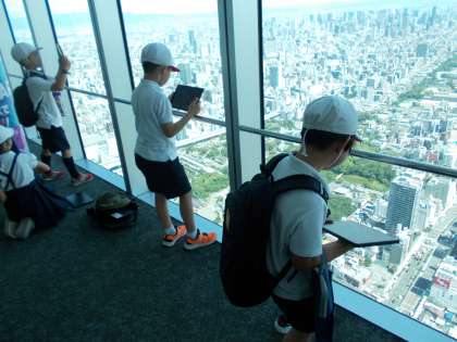 3年生が天王寺のあべのハルカスへ社会見学に行きました。60階(地上280メートル)の東西南北360度に足元から天井までのガラスを配した天井回廊でタブレットを使って大阪市の町の様子を学習しました。