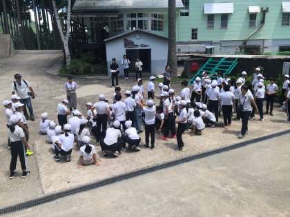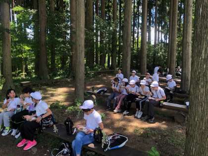 木陰で昼食のお弁当を食べたあと、避難訓練をしました。