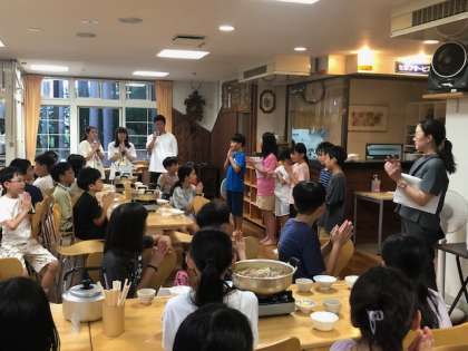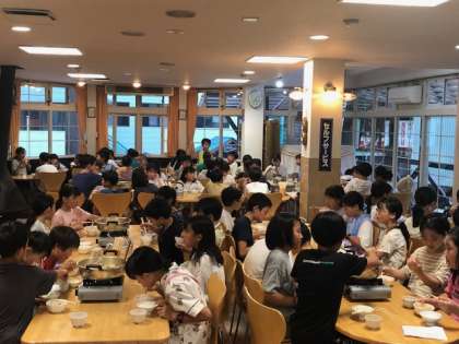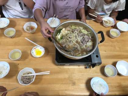 夕食の時間になりました。今夜の献立は「鴨なべ」です。各班ごとに上手に取り分けて、仲良く美味しくいただきました。