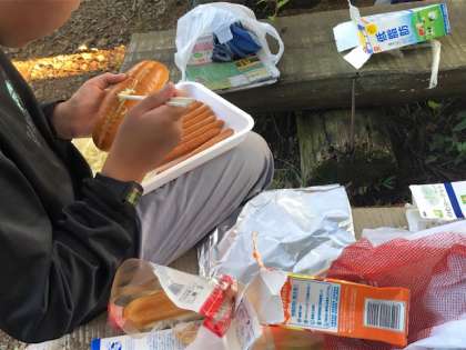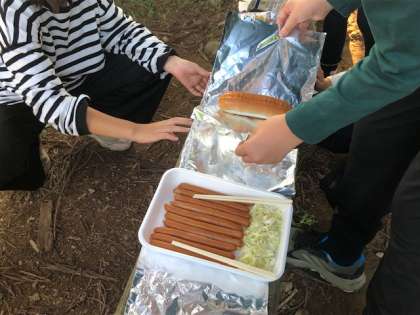 班で力を合わせてカートンドッグづくりを進めています。コッペパンにキャベツとウィンナーをはさみ、アルミ箔でくるみます。